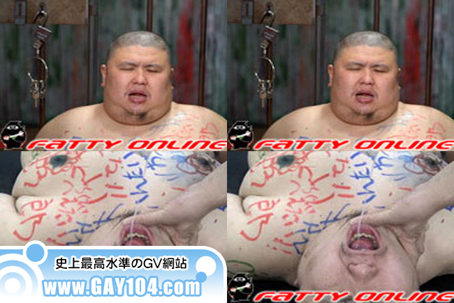 いじめられたい巨豚を興奮させるには「全身落書き」が最も効果的! カラフルなマジックで恥ずかしい言葉を書かれた巨豚は、ついさっき発射したにもかかわらずまたもや大量発射! そして放出した真っ白な精液は巨豚の口の中へ!